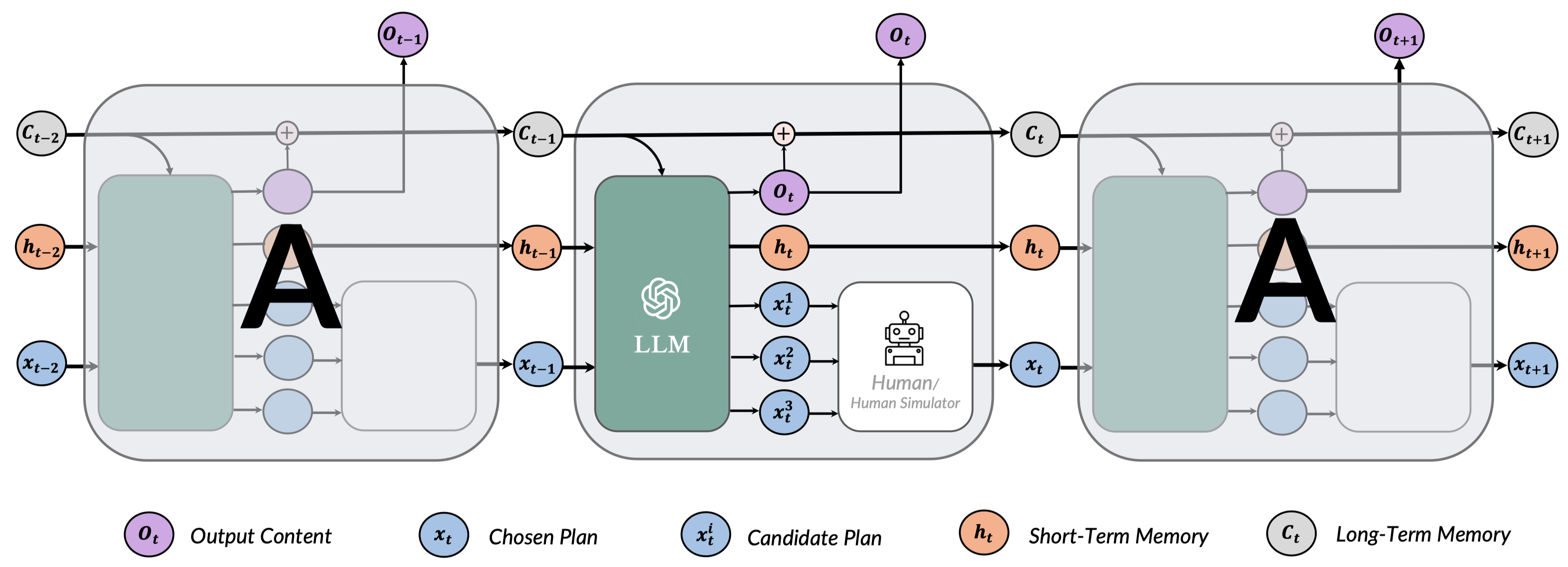 - 每一个时间步中,RecurrentGPT 会接收上一个时间步生成的内容、最近生成内容的摘要(短期记忆),历史生成内容中和当前时间步最相关的内容 (长期记忆),以及一个对下一步生成内容的梗概。RecurrentGPT 根据这些内容生成一段内容,更新其长短时记忆,并最后生成几个对下一个时间步中生成内容的规划,并将当前时间步的输出作为下一个时间步的输入。这样的循环计算机制打破了常规Transformer 模型在生成长篇文本方面的限制,从而实现任意长度文本的生成,而不遗忘过去的信息。