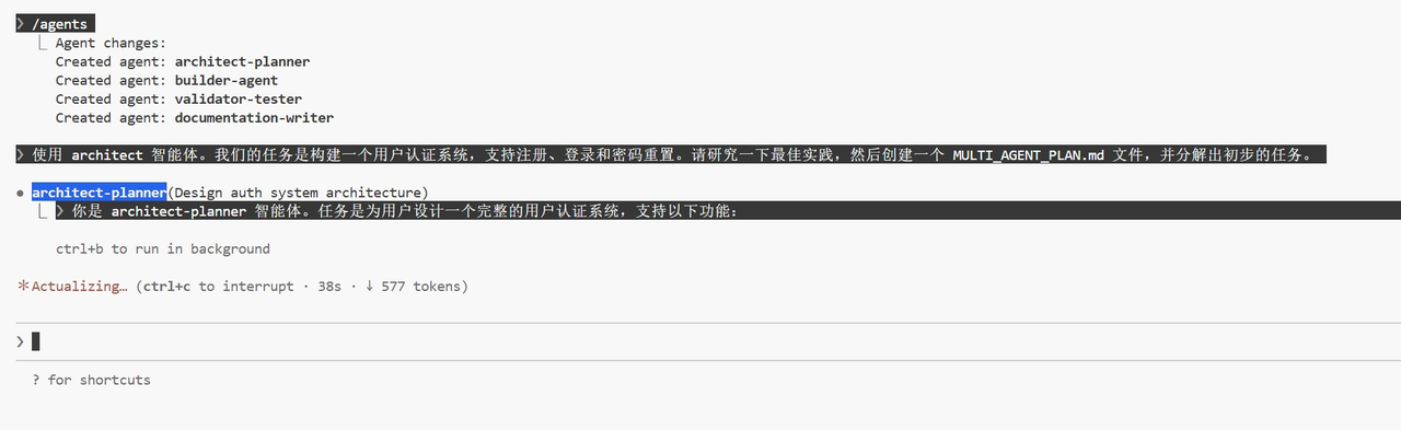 使用 architect 智能体。我们的任务是构建一个用户认证系统,支持注册、登录和密码重置。请研究一下最佳实践,然后创建一个 MULTI_AGENT_PLAN.md 文件,并分解出初步的任务。