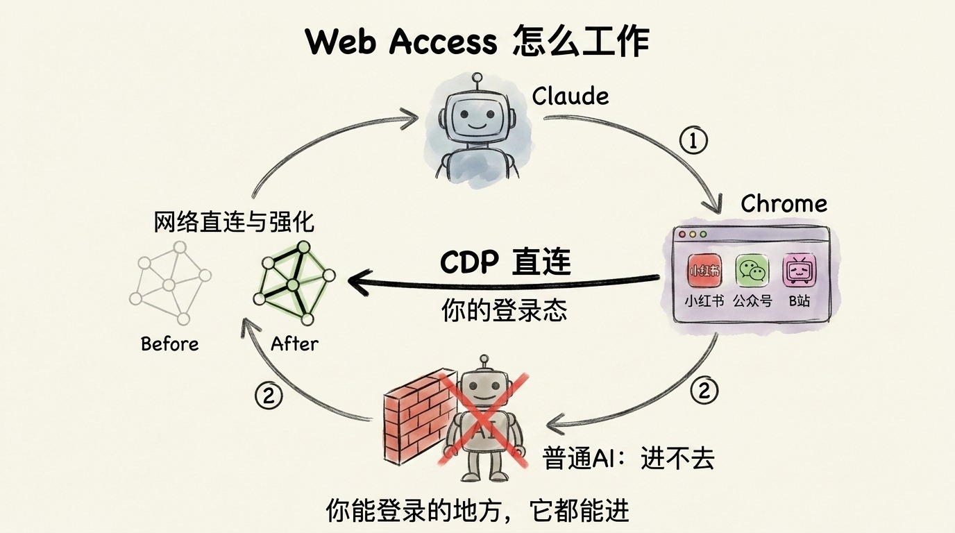 Web Access 这个 Skill 做了一件事:通过 CDP 直连你本地的 Chrome