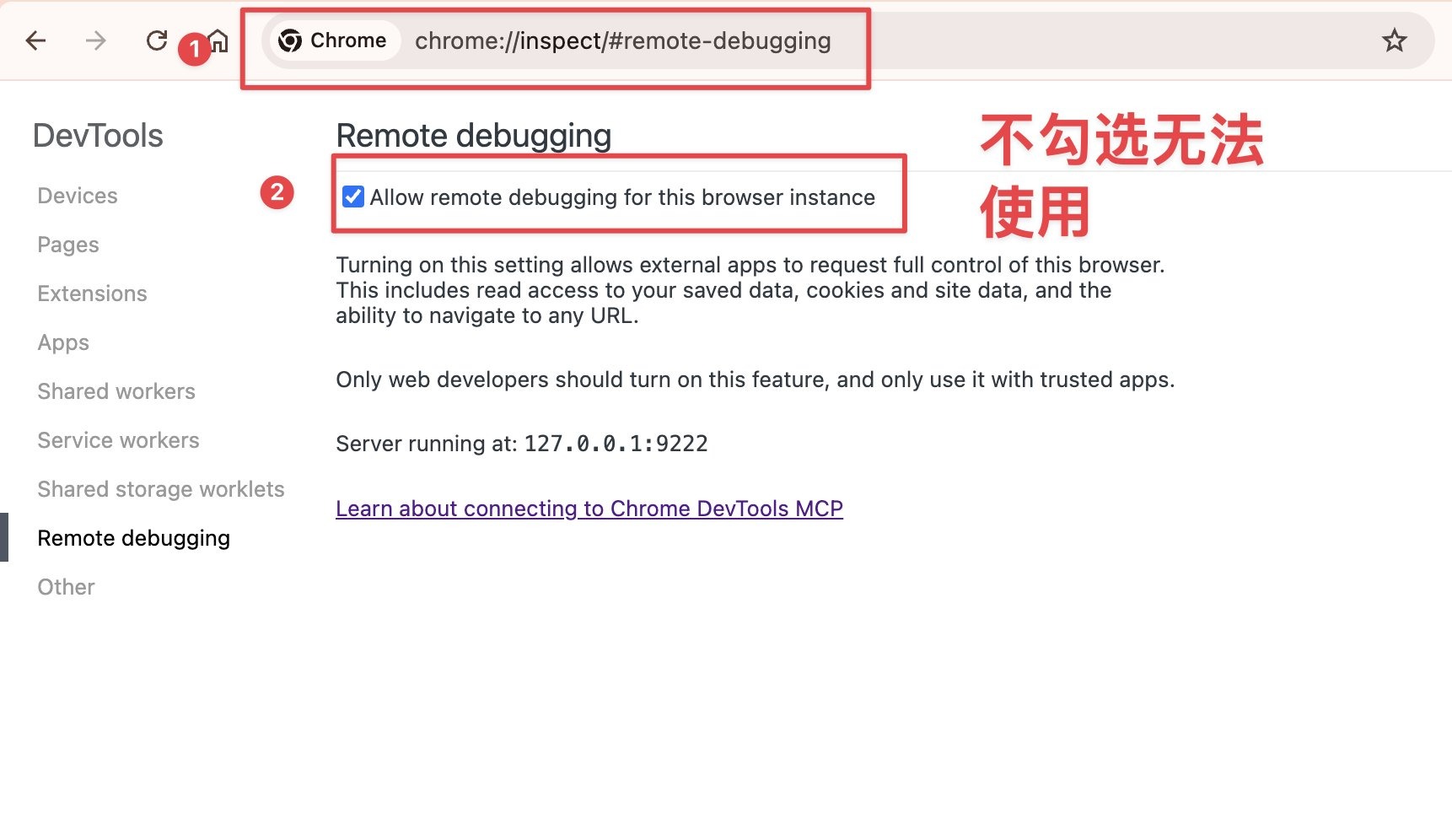 配置一步:Chrome 地址栏打开 chrome://inspect/#remote-debugging,勾上允许远程调试