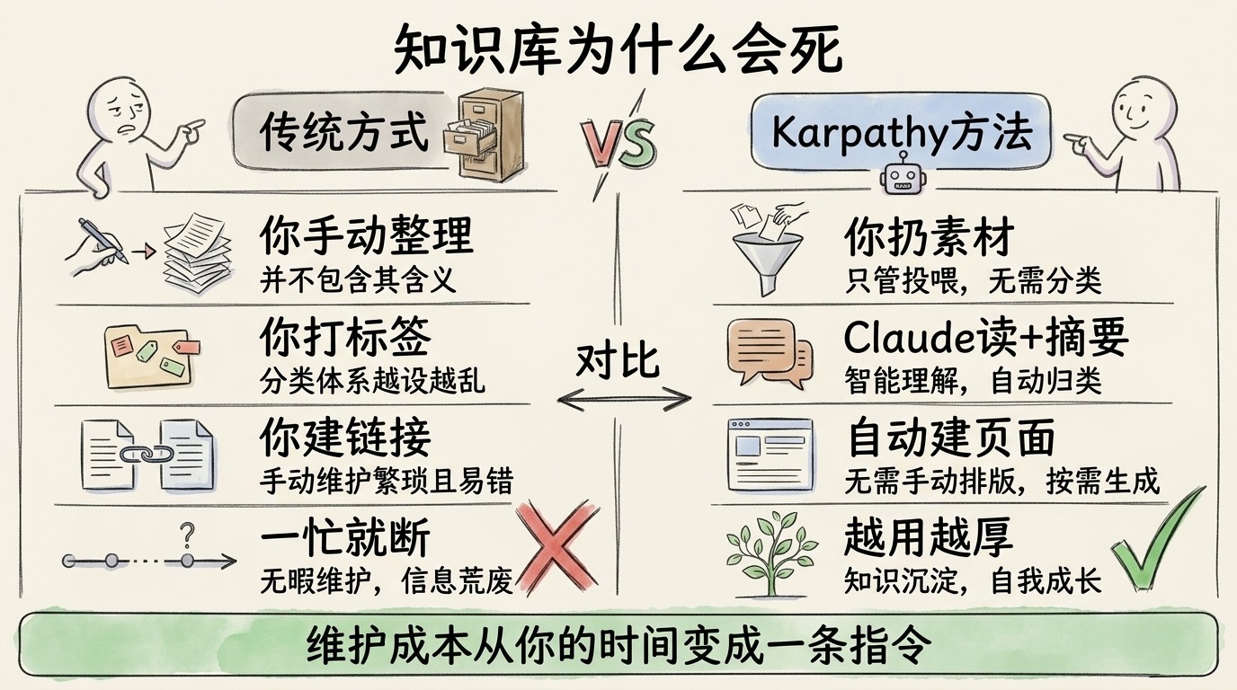 但Karpathy 的方法反过来:你只管扔素材进去,Claude 负责读、摘要、建页面、打双向链接