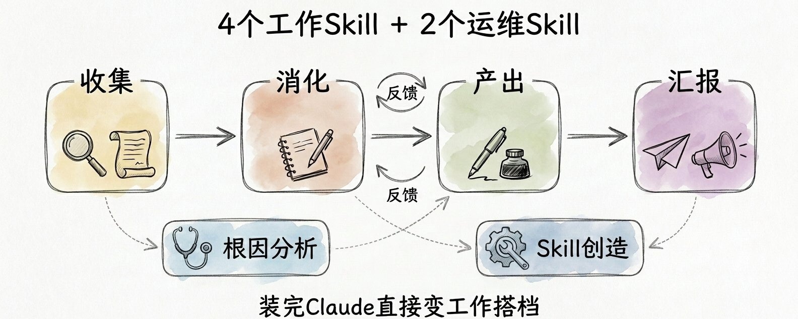 6 个 Skill,按收集、消化、产出、汇报排好位,加问题修复和 Skill 生成打底,这就是你的工作流框架。