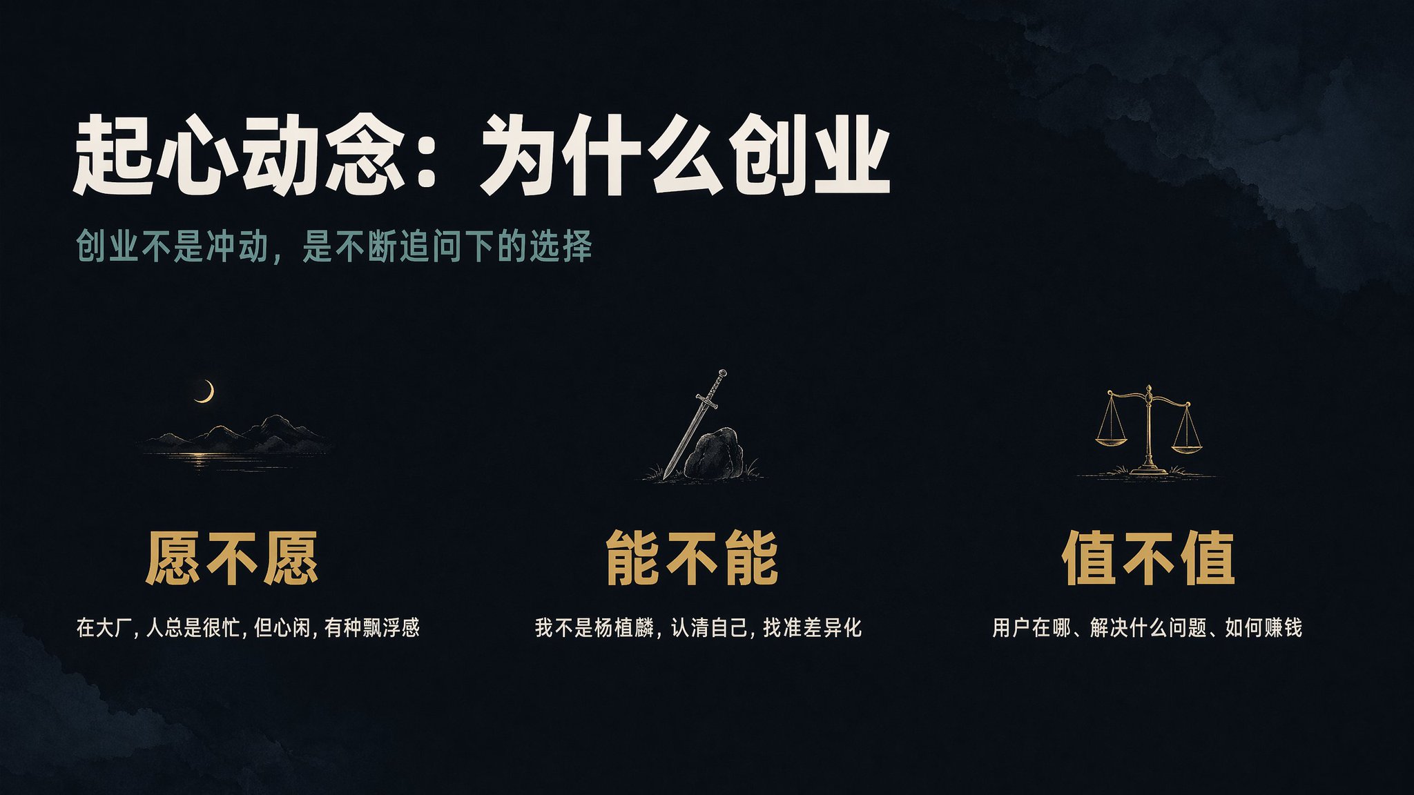 **愿不愿:**这是最根本的。创业的“愿”,很多时候来自于在大厂的“不愿”。不愿意继续在大平台上浪费时间。对时间的恐惧是真实的,“再不出来就老了”。