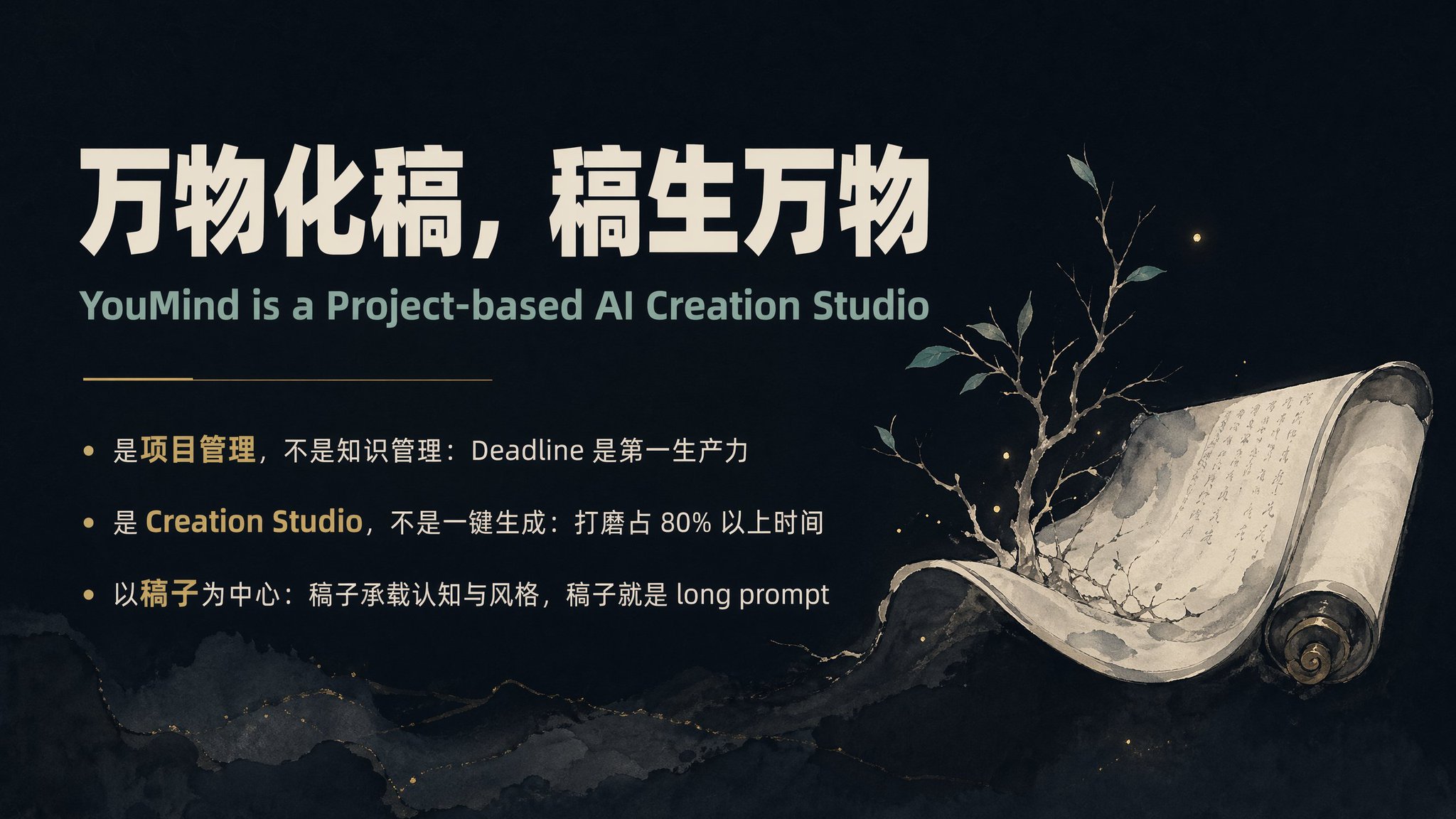 2024 年八九月份,我内心比较笃定了 YouMind 的产品定位,是 Project-based AI Creation Studio,一个基于项目的 AI 创作工作室。这个定位从确定到现在,从来没变过。