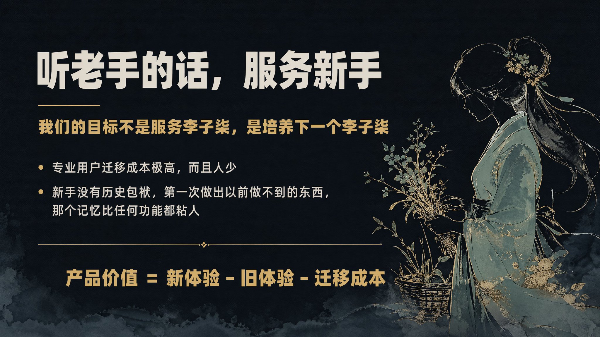 有意思的是,柳暗花明。我后来意识到,最大的市场其实是新手。想做内容创作、想做小红书的人,数量级远大于大 V。新手没有历史包袱,愿意试新工具。第一次做出以前做不出的东西,那个惊喜记忆,比任何产品功能都粘人。