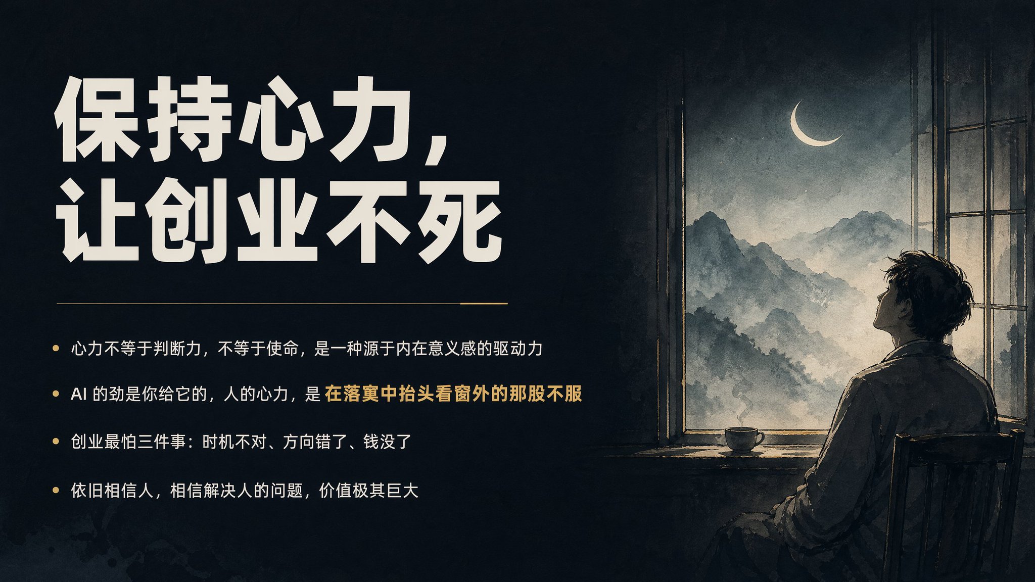AI 没有这股劲。AI 的劲是你给它的,而人的心力,是自己长出来的。有时候越丧的时候人越有力量,因为你是在蹲着的,蹲着的人比跳起来的人更有后劲。