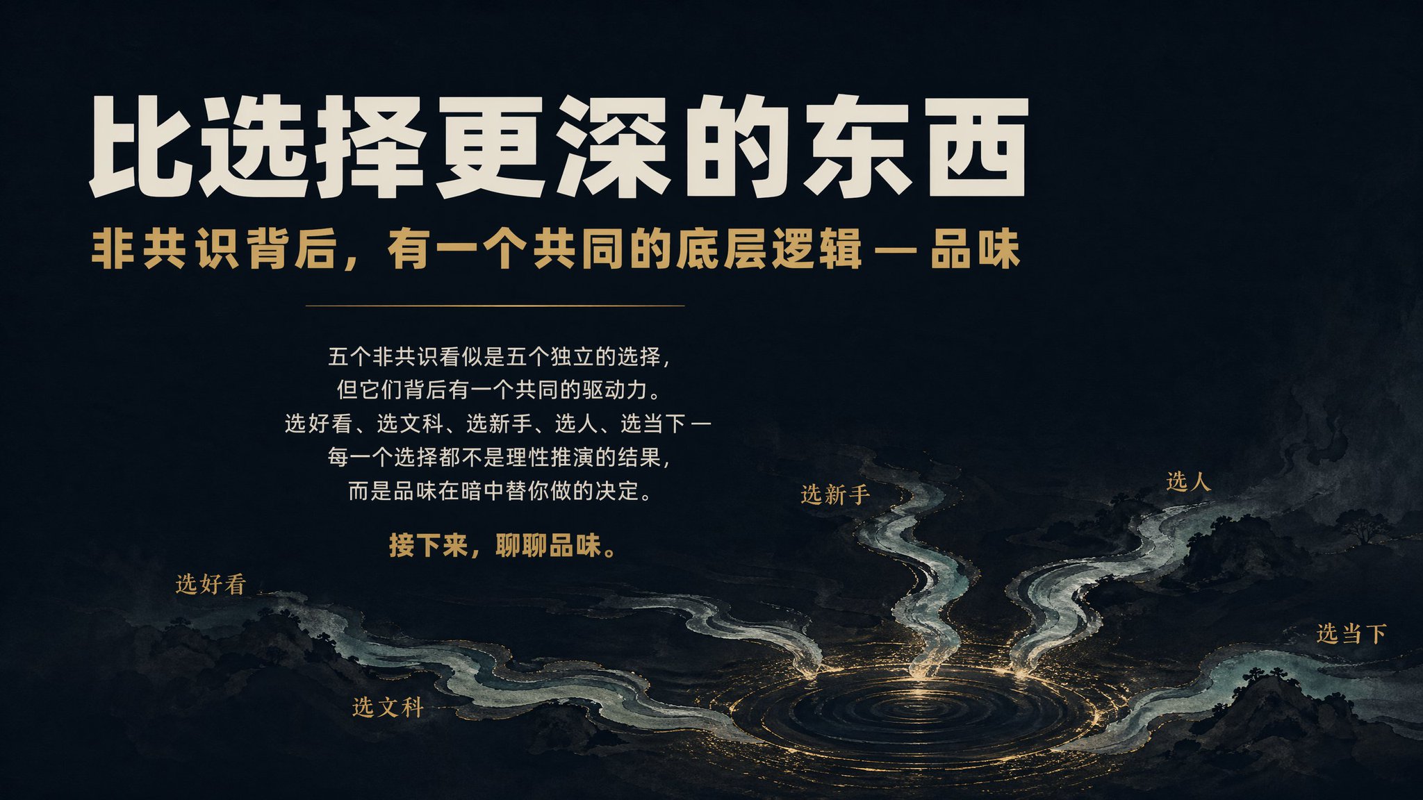 五个非共识看似是五个独立的选择,但它们背后有一个共同的驱动力:品味。选好看、选文科、选新手、选人、选当下,每一个选择都不是纯理性推演的结果,而是品味在暗中做决定。