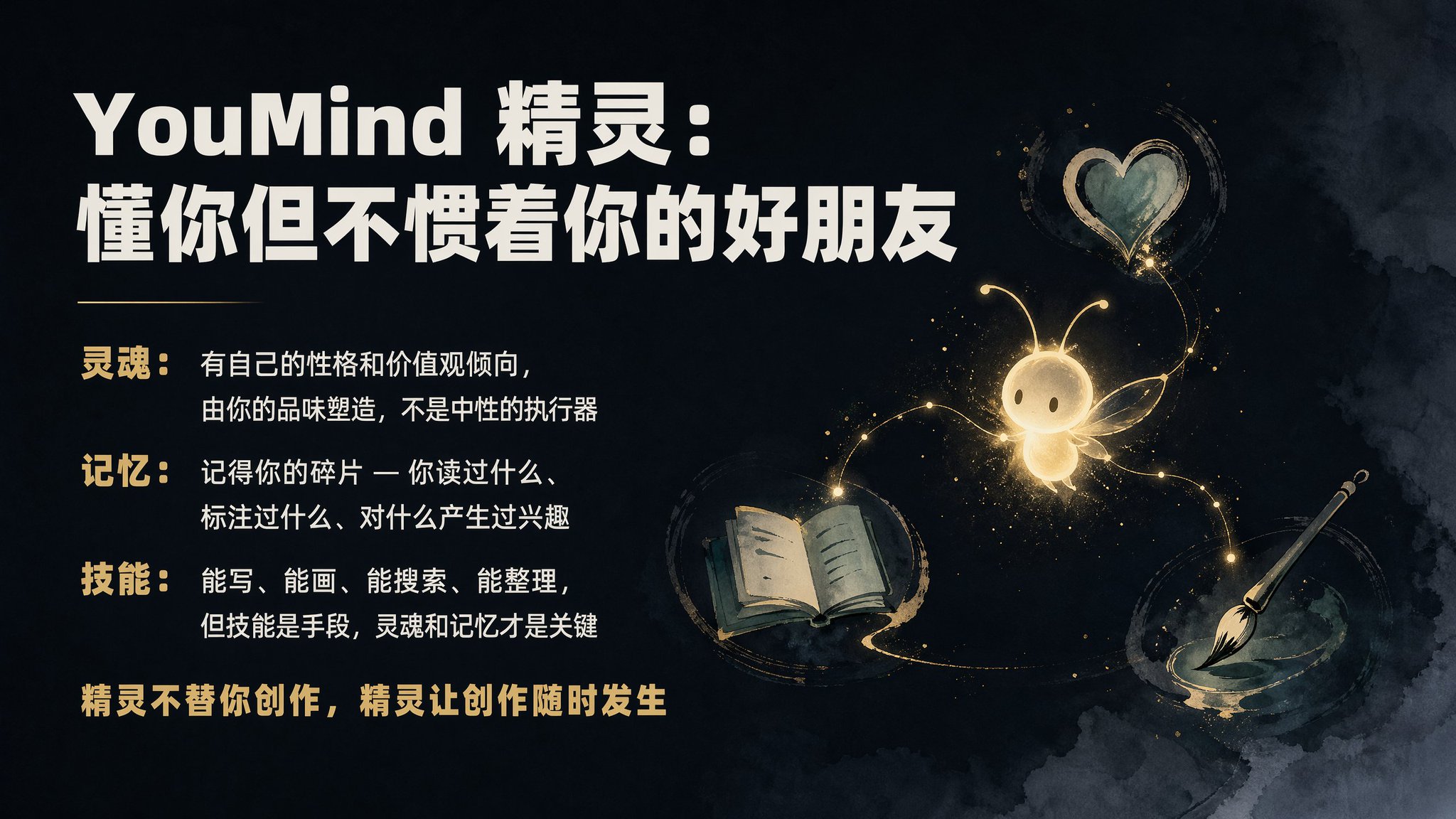这是我们正在做的“YouMind 精灵”:有灵魂(你的品味)+ 有记忆(你的碎片库)+ 有技能(创作工具链)。精灵不是你创建的工具,也不是你骑的马,它是你从精灵森林里召唤出来的,精灵是懂你但不惯着你的好朋友。