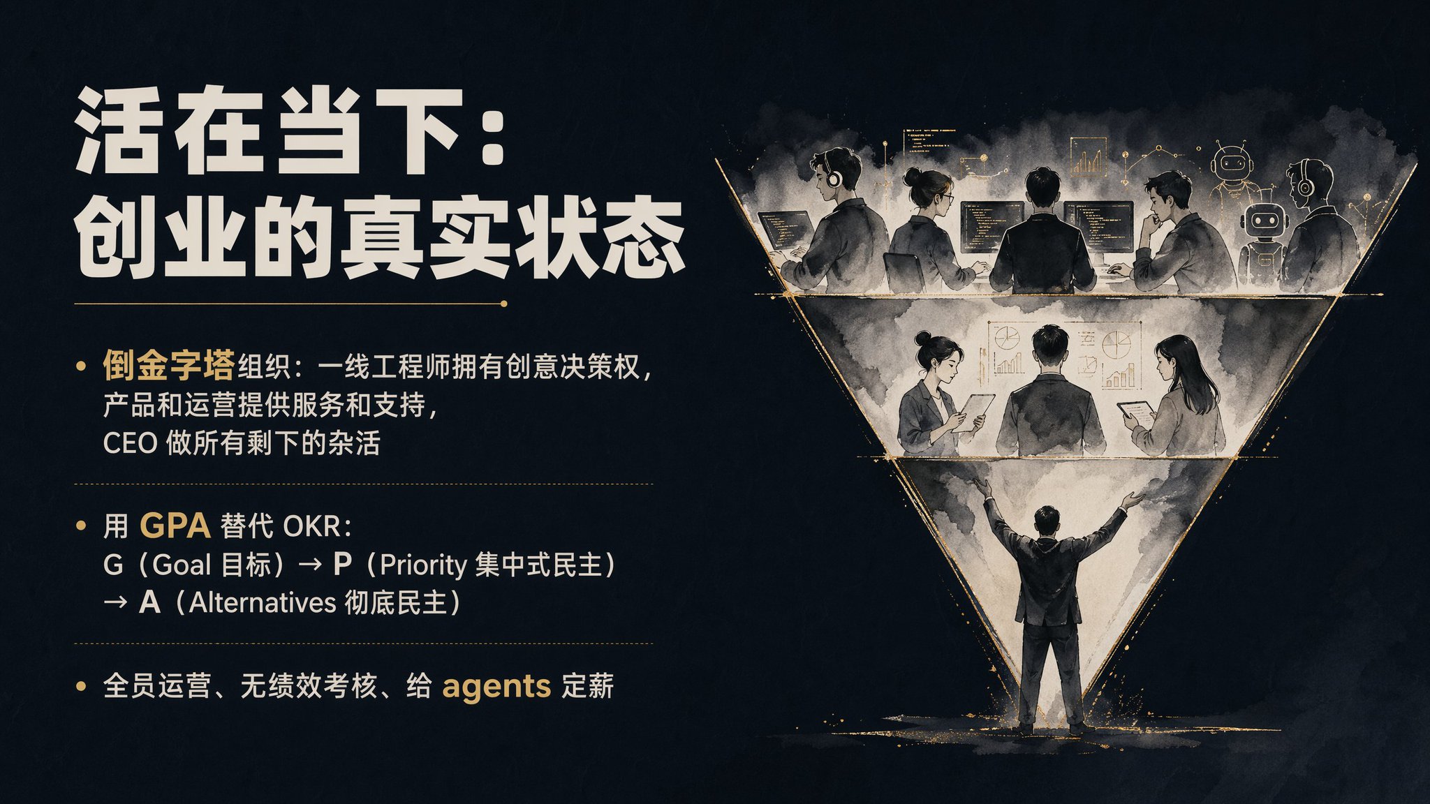 我们还用 GPA 框架替代了 OKR:G(Goal,独裁式目标设定)→ P(Priority,集中民主式优先级排序)→ A(Alternatives,彻底民主式方案选择)。团队无绩效考核,人人都是全干工程师。招人只看两点:对这件事是否真正感兴趣,以及学习能力,学习能力的核心判断标准是动手能力。