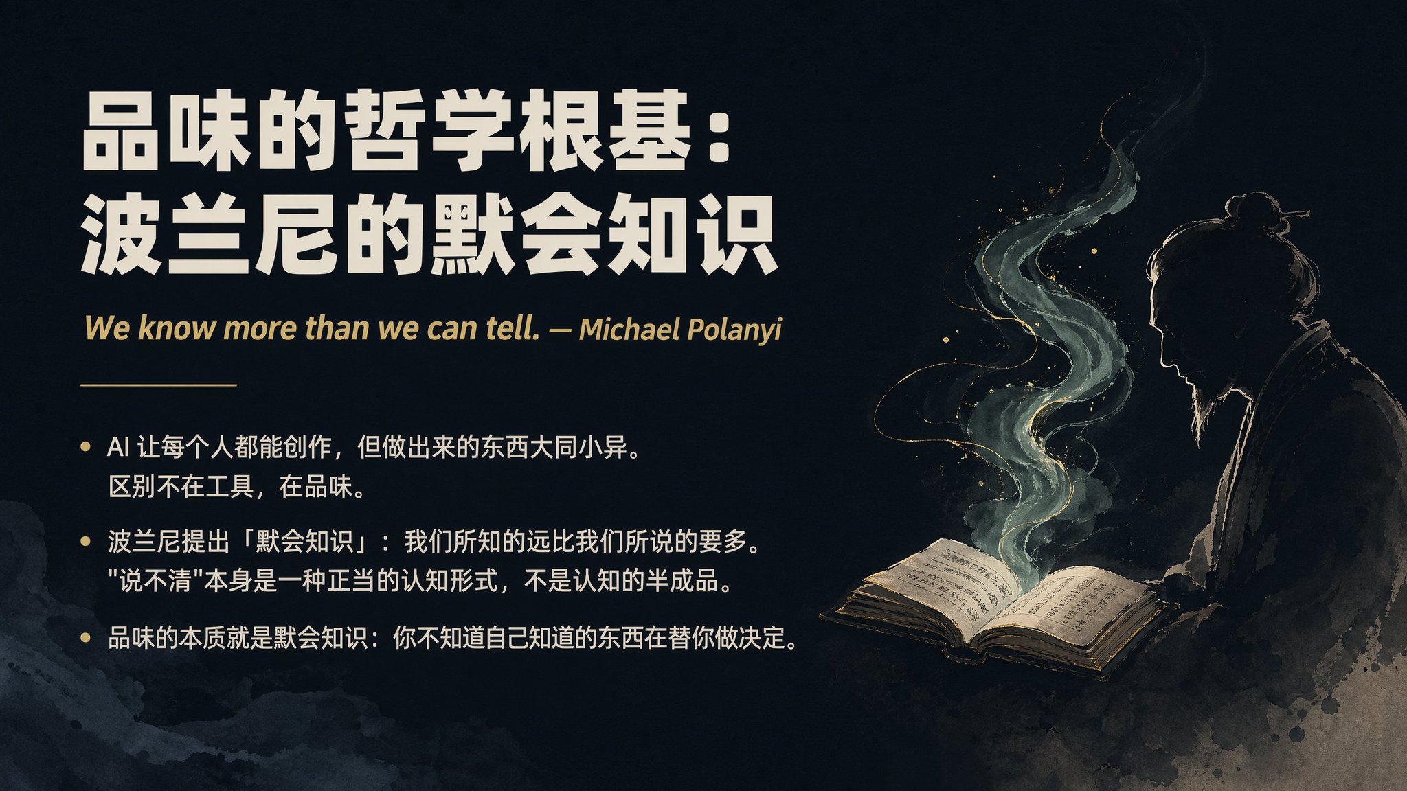为了想清楚“品味”这件事,我花了将近一个月时间,把历史上关于品味的哲学流派都系统梳理了一遍。给我冲击最大的是波兰尼提出的“默会知识”: